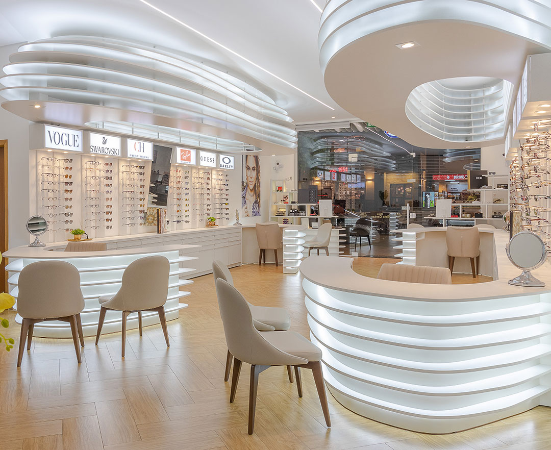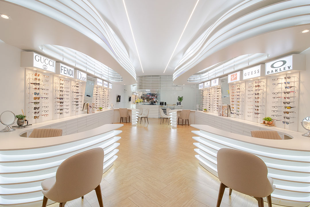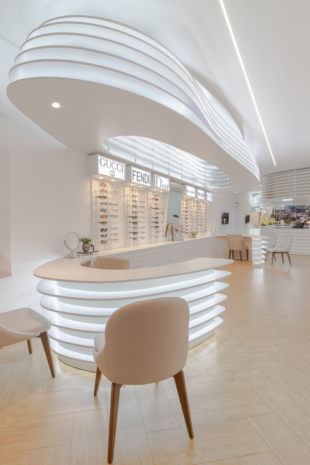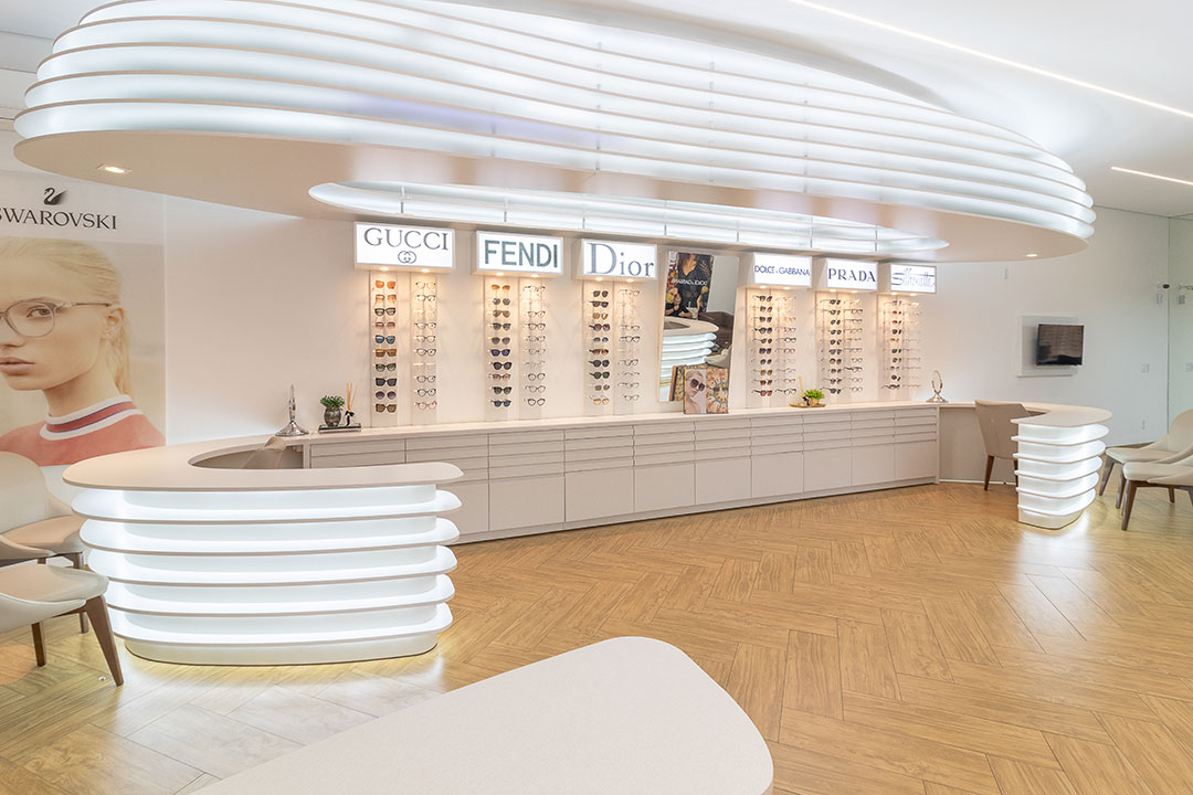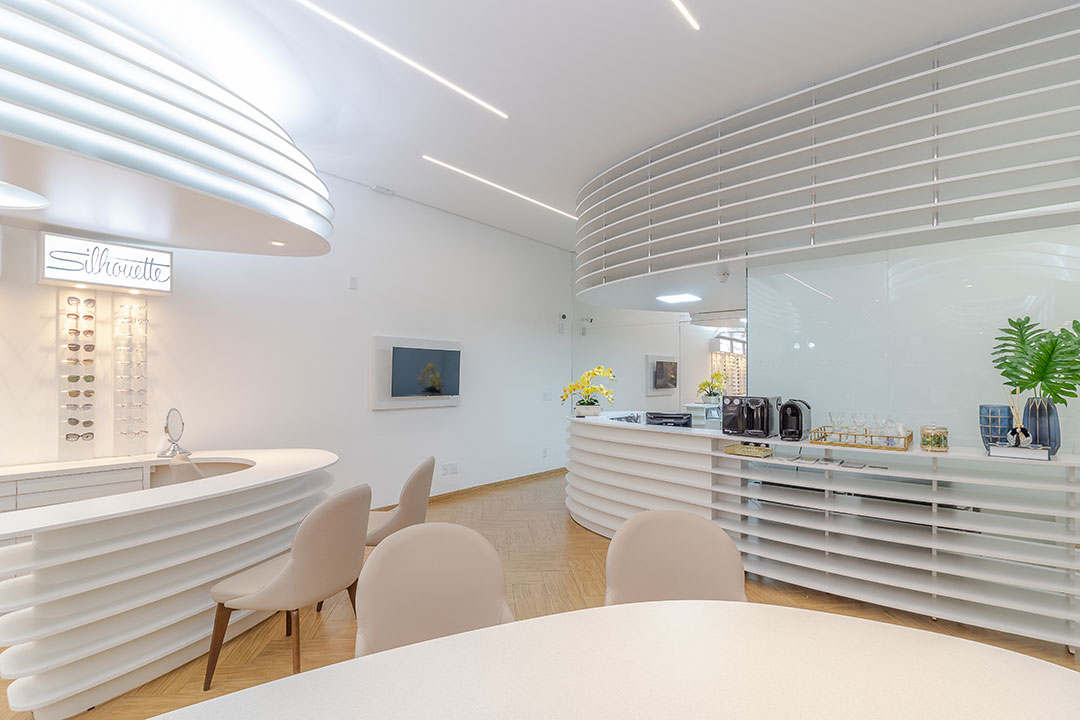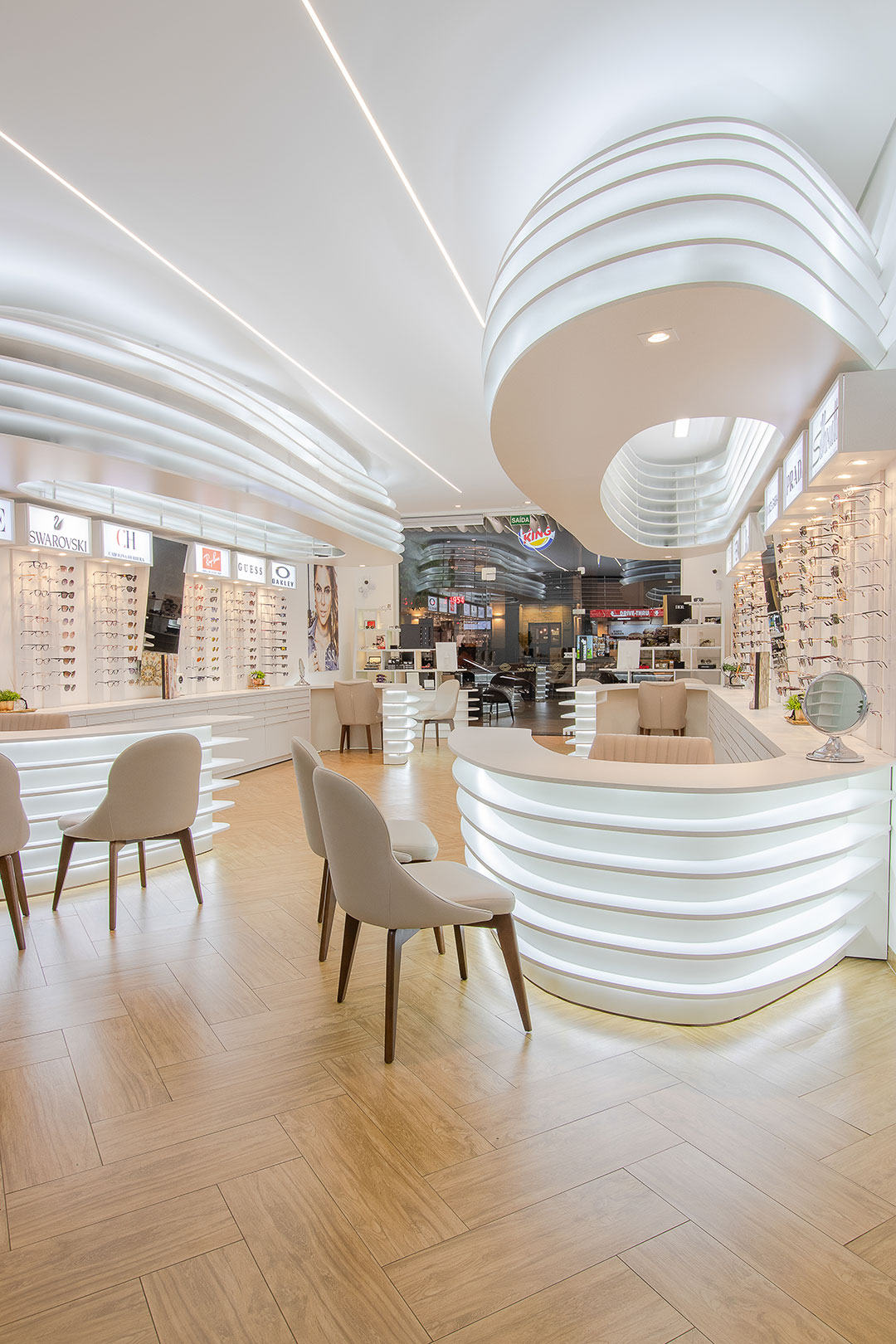 Clientes precisavam atualizar sua ótima para atender as necessidades do seu publico alvo. Foi feito um projeto elegante com um designer organico feito através de parametrização do mobiliários. Com uma referência de interiores escandinamos. Onde a base foi feita de madeira e o restante da construção em tons brancos. Dando um fundo para exposição dos óculos.