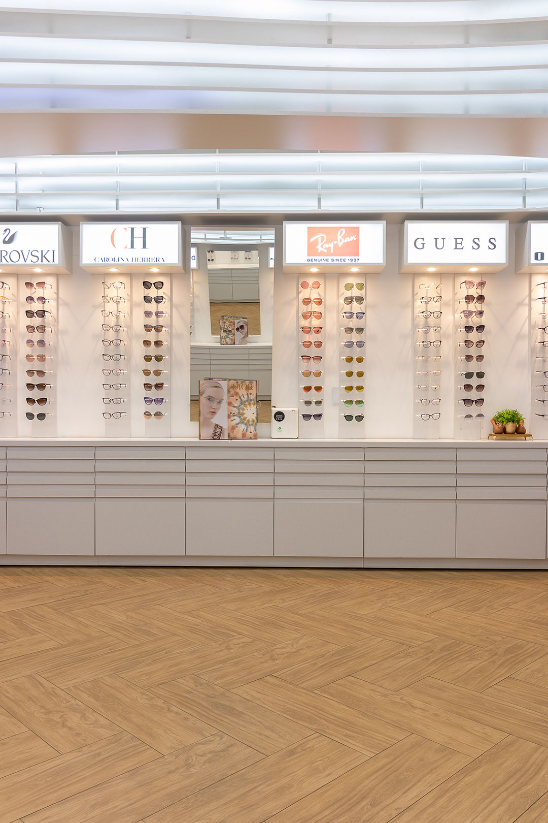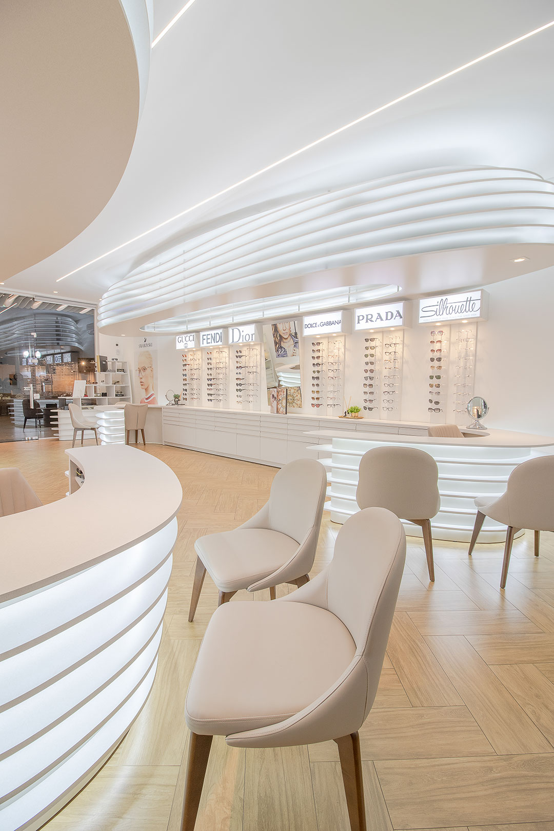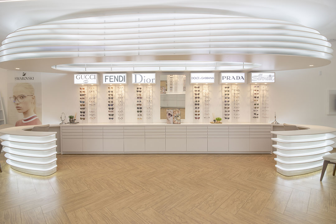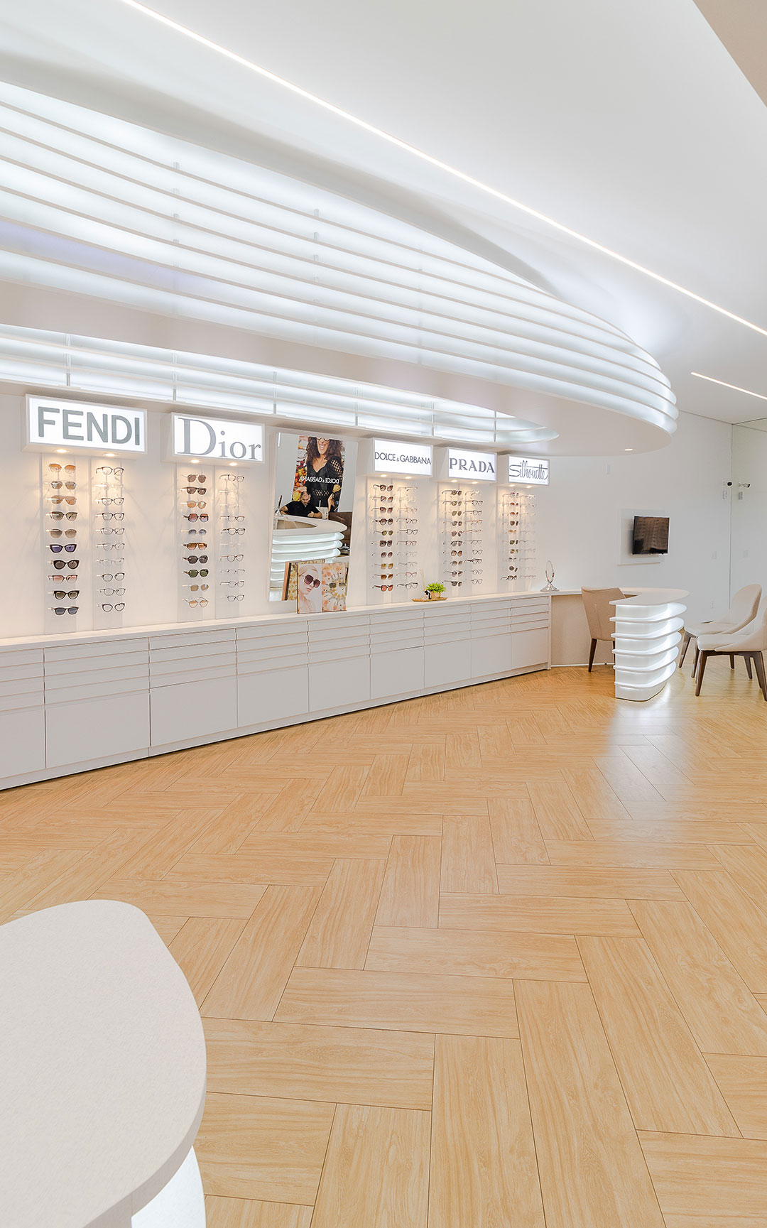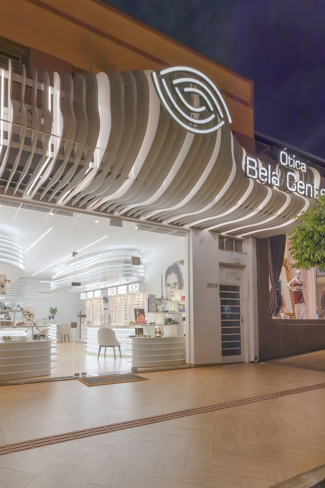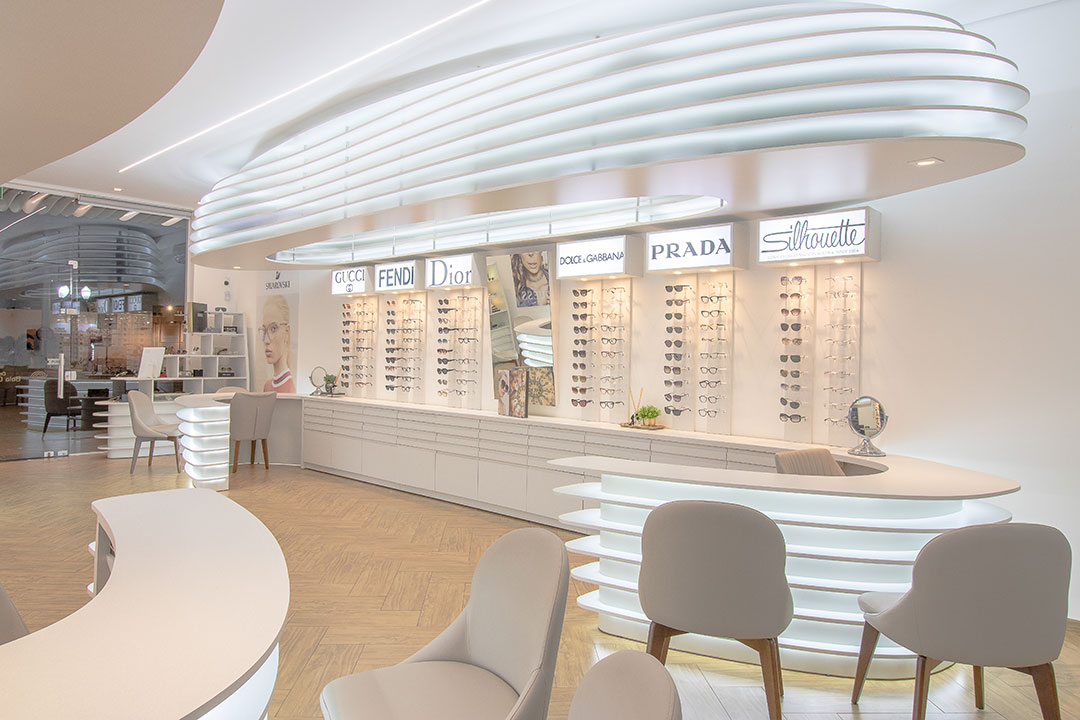 Clientes precisavam atualizar sua ótima para atender as necessidades do seu publico alvo. Foi feito um projeto elegante com um designer organico feito através de parametrização do mobiliários. Com uma referência de interiores escandinamos. Onde a base foi feita de madeira e o restante da construção em tons brancos. Dando um fundo para exposição dos óculos.